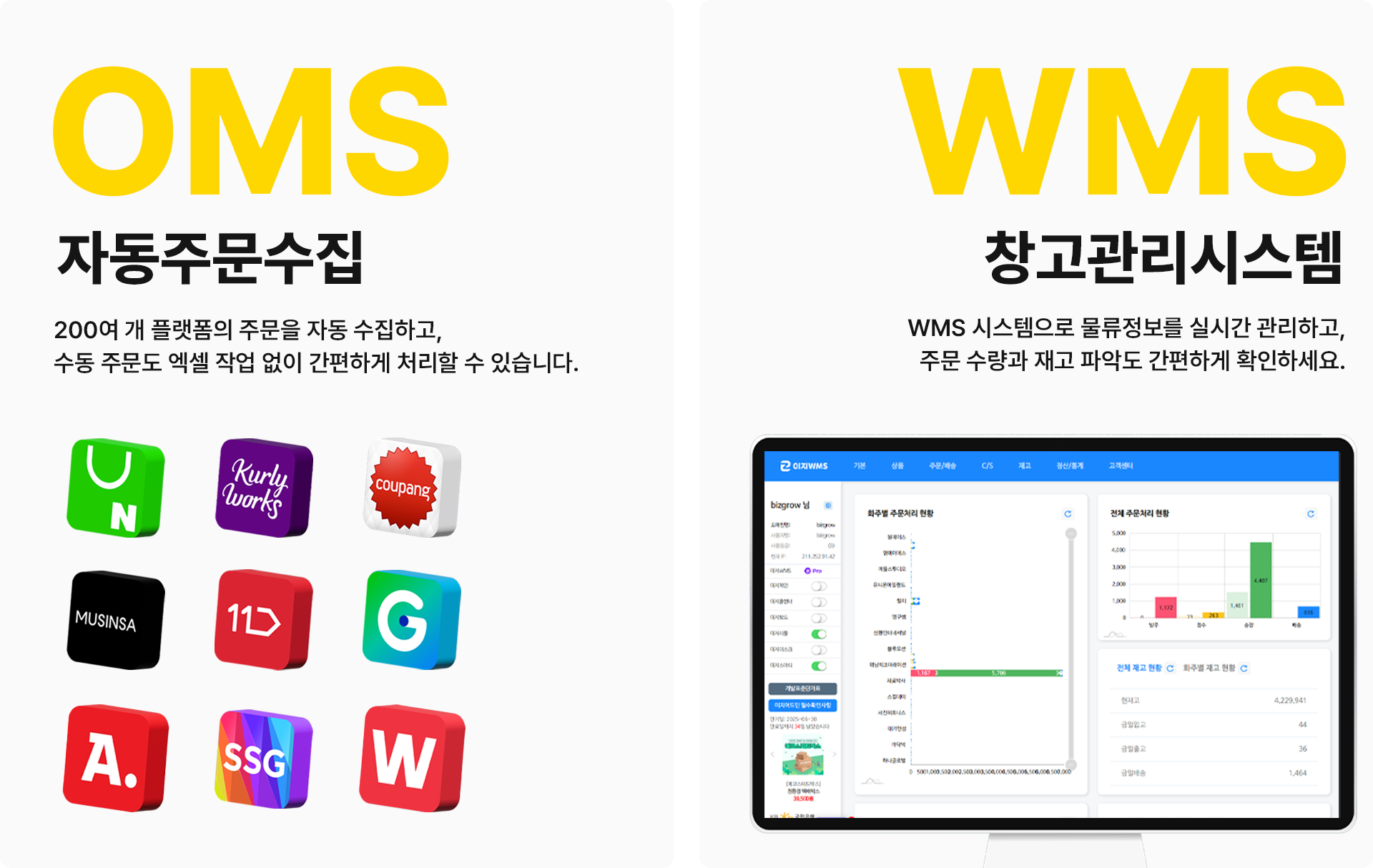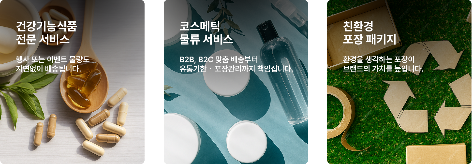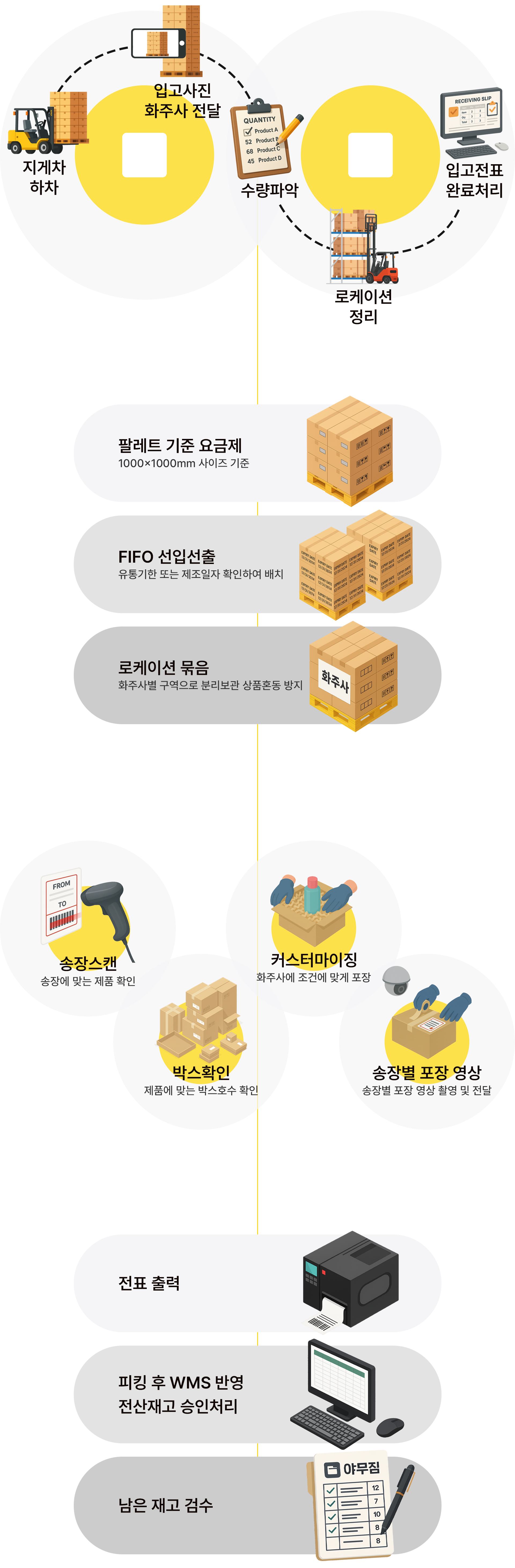 풀필먼트 서비스 3PL 야무짐 당신의 성장을 함께하는 든든한 서포터 무료 견적 신청 물류는 걱정하지 마세요 야무짐이 해결해 드리겠습니다. 재고관리 송장등록 배송시작 제품포장 주문수집 배송추적 교환 반품 배송완료 정산 궁금할 틈이 없는 알림 서비스 야무짐은 전용 단톡방과 전담 매니저를 통해 실시간으로 빠르게 전달해 드립니다. 전문성으로 완성되는 풀필먼트 업종별 특화된 물류, 포장, 배송 서비스를 통해 브랜드 가치를 지켜드립니다. 건강기능식품 전문 서비스 행사 또는 이벤트 물량도 지연없이 배송됩니다. 코스메틱 물류 서비스 B2B, B2C 맞춤 배송부터 유통기한 포장관리까지 책임집니다. 친환경 포장 패키지 환경을 생각하는 포장이 브랜드의 가치를 높입니다. 물류의 시작과 끝 입고부터 출고까지 모든 과정을 체계적으로 관리합니다. 상품이 우리 손을 거치는 모든 순간 정확함과 신속함을 원칙으로 합니다. 지게차 하차 입고사진 화주사 전달 수량 파악 로케이션 정리 입고전표 완료처리 팔레트 기준 요금제 FIFO 선입선출 유통기한 또는 제조일자 확인하여 배치 로케이션 묶음 화주사별 구역으로 분리보관 상품혼동 방지 송장스캔 송장에 맞는 제품 확인 박스확인 제품에 맞는 박스 호수 확인 커스터마이징 화주사 조건에 맞게 포장 송장별 포장 영상 송장별 포장 영상 촬영 및 전달 전표 출력 피킹 후 WMS 반영 전산재고 승인처리 남은 재고 검수 야무짐과 함께 만드는 풀필먼트 배송의 새로운 기준 빠르고 정확한 물류 서비스로 비즈니스 경쟁력을 높입니다. 모든 물류 한 시스템에 담다 OMS로 주문을 정확하게, WMS로 물류를 유연하게 안정성과 효율성을 모두 갖춘 물류 시스템을 제공합니다. OMS 자동주문수집 200여 개 플랫폼의 주문을 자동 수집하고, 수동 주문도 엑셀 작업 없이 간편하게 처리할 수 있습니다. WMS 창고관리시스템 WMS시스템으로 물류 정보를 실시간 관리하고, 주문 수량과 재고 파악도 간편하게 확인하세요.3pl